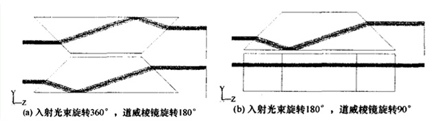 光纖滑環是實現旋轉端與固定端光信號連續傳輸的樞紐,是一種精密的光學傳輸器件,目前應用的光纖滑環有單通道和多通道之分 ,單通道要求單路同軸對準,實現原理簡單,多通道光纖滑環則需要通過光路折轉來實現光信號的連續傳輸 。 目前大多數多通道光纖滑環的實現原理都基于道威棱鏡 的光傳輸特性,如圖1所示,當道威棱鏡自身轉速為輸入平行光束繞其轉軸旋轉轉速的一半時,經過道威棱鏡輸出的光束位置不變,因此只要保證2:1的傳動關系,就可實現多路光信號的旋轉傳輸。