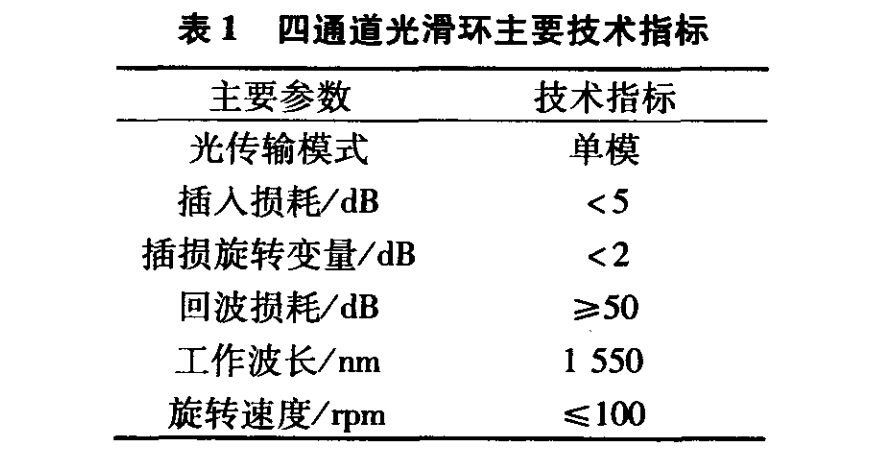 本方案中的四通道光纖滑環,經試驗驗證,可以滿足軍品使用要求,其主要技術指標見表 1,外形尺寸為∅88mm ×156mm,體積很小 。