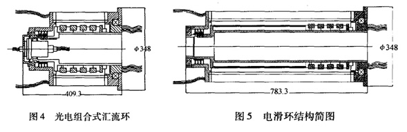 在光電滑環的組合設計上,考慮減小整體的軸向尺寸 ,本方案充分利用了中心孔,將光纖滑環套裝在其內部,結構簡圖如圖4所示。 如果系統不采用光纖滑環,直接應用傳統電滑環的傳輸形式,則需在原傳輸通道上另外增加180路小信號環,按此要求設計的電滑環結構簡圖如圖5所示,與光電組合式匯流環相比除軸向尺寸、轉動力矩大幅度增加外,信號的抗干擾能力及傳輸速率的下降大大降低了系統性能。