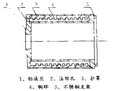 電滑環(huán)是我司的主要產(chǎn)品,所用環(huán)氧膠的配方就直接涉及其零件之一滑環(huán)(其結(jié)構(gòu)如圖1所示)的灌腔質(zhì)量,由于我們所一直延用過去的配方,在機械加工時,常出現(xiàn)粘接強度不夠,被刀具擠裂,以及出現(xiàn)氣泡、裂紋等現(xiàn)象,為了解決這個問題,我們通過改變環(huán)氧樹脂膠粘劑配方、灌膠工藝等措施,來提高環(huán)氧樹脂性能和滑環(huán)的穩(wěn)定性。下面就這個問題局部進行探討。