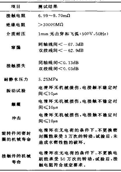為保證導電滑環的水密性,在幾個會進水的部位,都用“o”形圈進行密封,在不需轉動處采用一道“o”形圈,而在兩端法蘭與軸轉動處及外殼與支架接觸的兩端,均采用兩道“o”形圈,從而保證做到能耐靜水壓5.25MPa,另外,還考慮在進線處及出線處對電纜進行特殊的密封處理,從而保證不會有海水滲人。該導電滑環裝置的測試結果如下表所示。