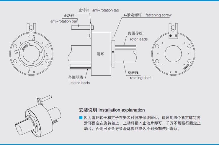 ■ 在滑環安裝時,務必要保護好導線,避免因導體絕緣層損壞而影響產品品質
