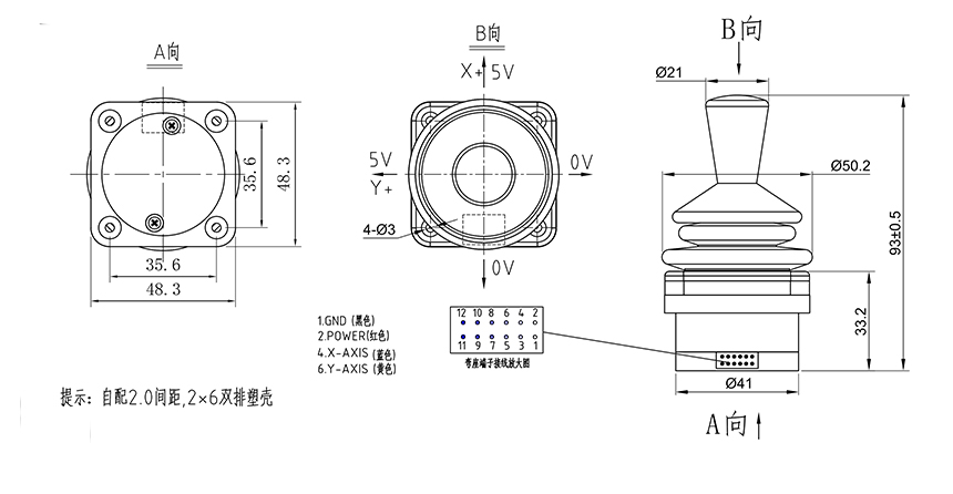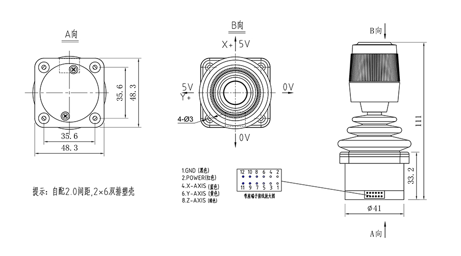 導(dǎo)線顏色順序 紅色=5 VDC電源正極 黑色=電源負(fù)極 藍(lán)色=X軸 黃色=Y軸 綠色=Z軸 白色=開關(guān) 橙色=開關(guān)